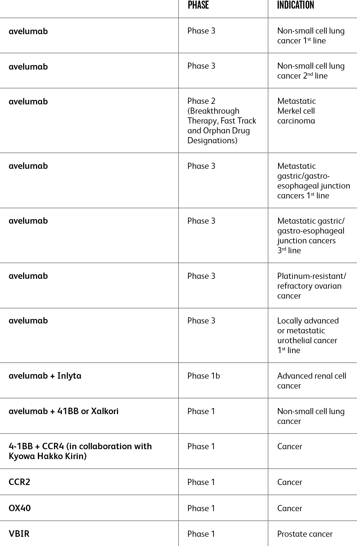 In 2015, avelumab, an investigational fully human anti-PD-L1 IgG1 monoclonal antibody being co-developed with Merck KGaA, Darmstadt, Germany (Merck KGaA) was granted Orphan Drug designation in the U.S. and the EU, and Fast Track and Breakthrough Therapy designations in the U.S. for the treatment of metastatic Merkel cell carcinoma, a rare and aggressive type of skin cancer. If successful, the first potential commercial launch of avelumab is anticipated in 2017. As of December 31, 2015, the clinical development program for avelumab included more than 1,500 patients who had been treated across more than 15 tumor types, including breast cancer, gastric/gastro-esophageal junction cancers, head and neck cancer, Merkel cell carcinoma, melanoma, non-small cell lung cancer, ovarian cancer, renal cell carcinoma and urothelial (i.e., bladder) cancer. The alliance has initiated six pivotal trials, reaching its goal for 2015, with additional trials expected to initiate in 2016. Pfizer and Merck KGaA presented data from six studies evaluating the potential role of PD-L1 inhibition and avelumab's safety and efficacy at the European Cancer Congress 2015.