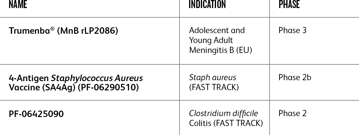 We have two prophylactic vaccines for hospital-acquired infections in Phase 2 trials, one to help prevent Clostridium difficile (C. difficile) disease and one to help prevent Staphylococcus aureus (S. aureus) infections. Both of these investigational vaccines have been granted Fast Track status by the U.S. Food and Drug Administration.