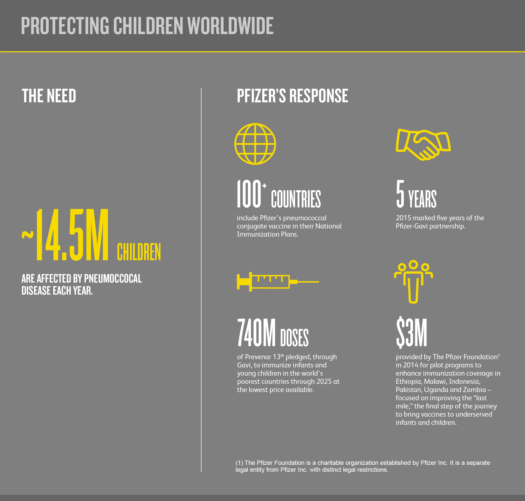 Gavi, the Vaccine Alliance, through its Advanced Market Commitment, provides vaccines to the world's poorest countries on an accelerated, affordable and sustainable basis. Pfizer has committed to supply up to 740 million doses of Prevenar 13® (pneumococcal polysaccharide conjugate vaccine, 13-valent adsorbed) through 2025. Prevenar 13 is available in more than 40 Gavi-eligible countries, with additional launches planned. We are committed to helping meet the Advanced Market Commitment's primary goal of reducing morbidity and mortality from pneumococcal disease and, specifically, to prevent an estimated seven million childhood deaths by 2030.