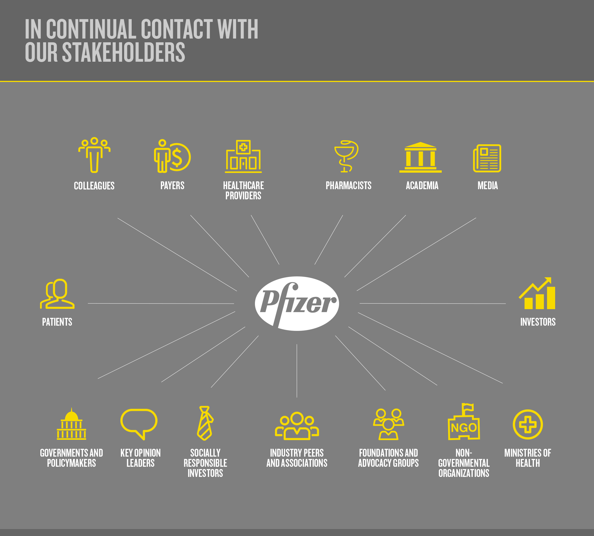 Our efforts to reach more people with more medicines would not be possible without our partnerships with non-governmental organizations (NGOs), governments, foundations and other stakeholders. An important part of Pfizer's corporate responsibility and commercial strategy is to focus on building and advancing relationships with large international organizations, civil society and foundations to help ensure communities in need get the health care they deserve. Our strategy regarding global stakeholders and institutions is to focus on finding common objectives to advance public health and build sustainable programs that create solutions with a measurable impact.